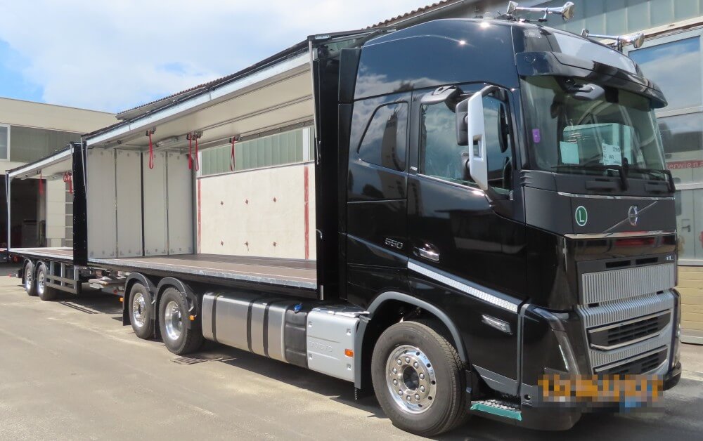 Wingliner mit Anhänger für Holztransport – geöffnet