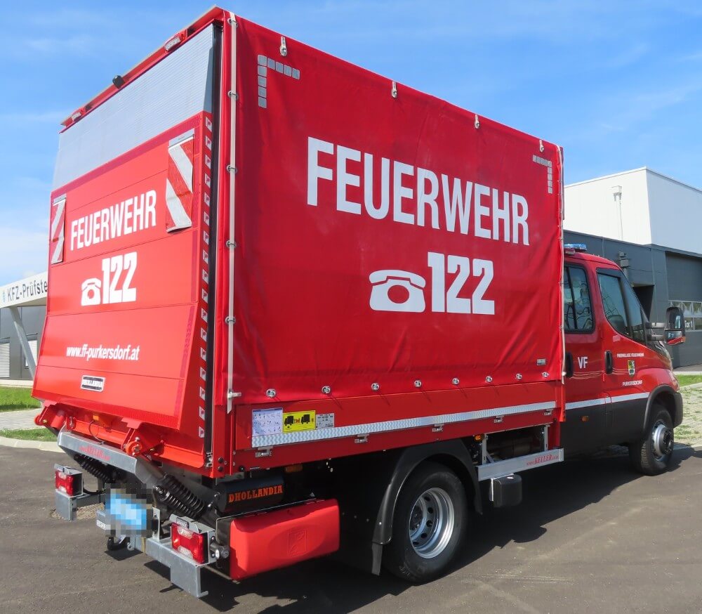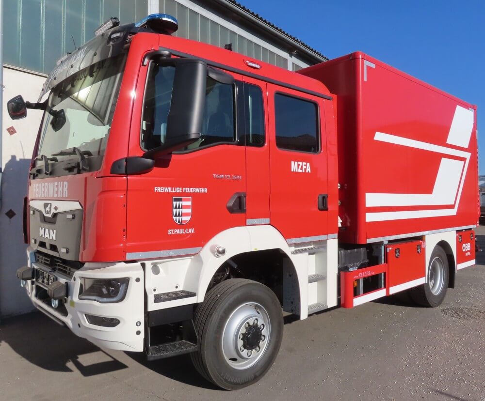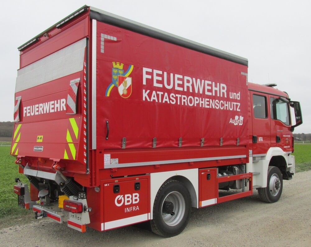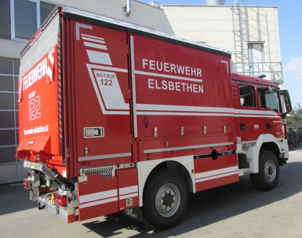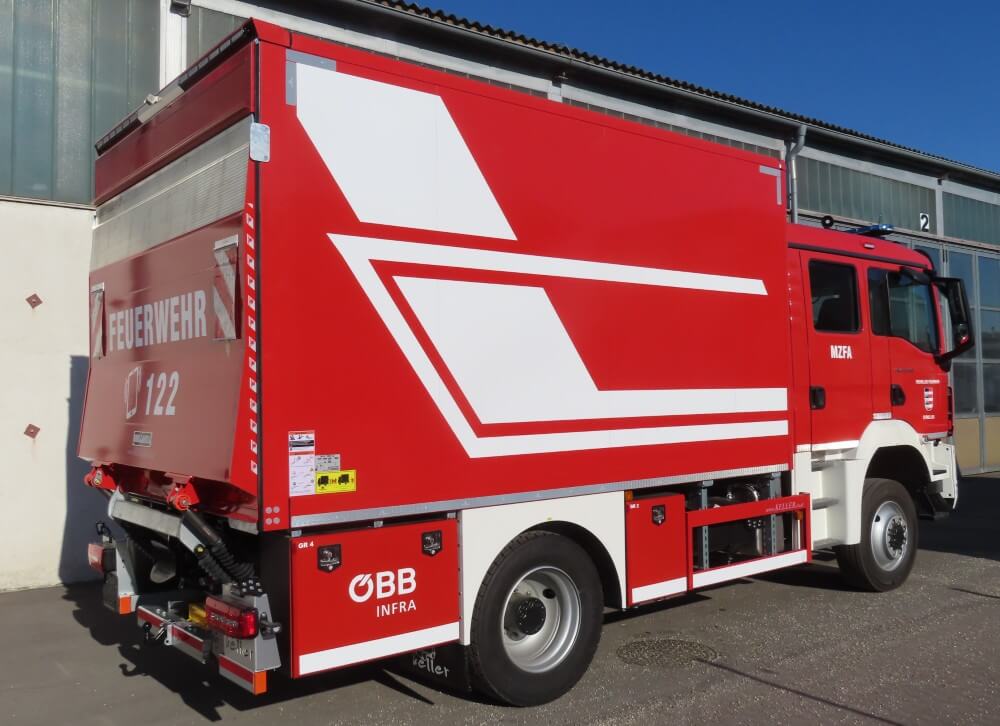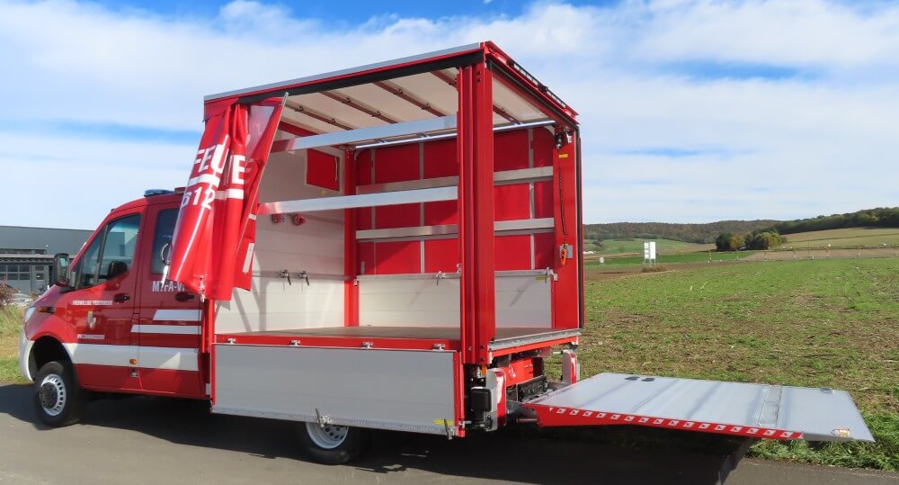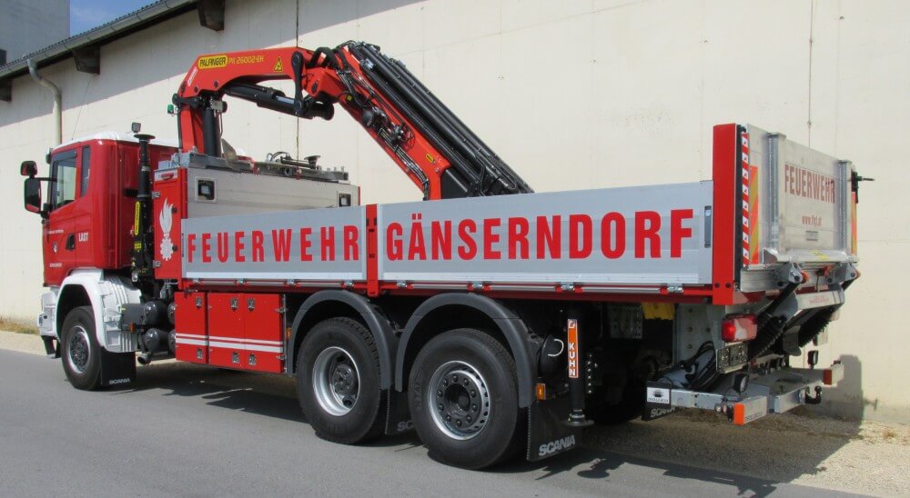 Lösungsvarianten mit Ladekran bzw. Ladebordwand sind im Feuerwehrwesen durchaus weit verbreitet. Diese Fahrzeugkategorie dient primär für Logistikaufgaben unter anderem für sperrige Lasten. Ausrüstungsgegenstände können in Gerätekästen mitgeführt werden, welche über die Mindestbeladung eines Versorgungsfahrzeuges (VF) hinausreichen.